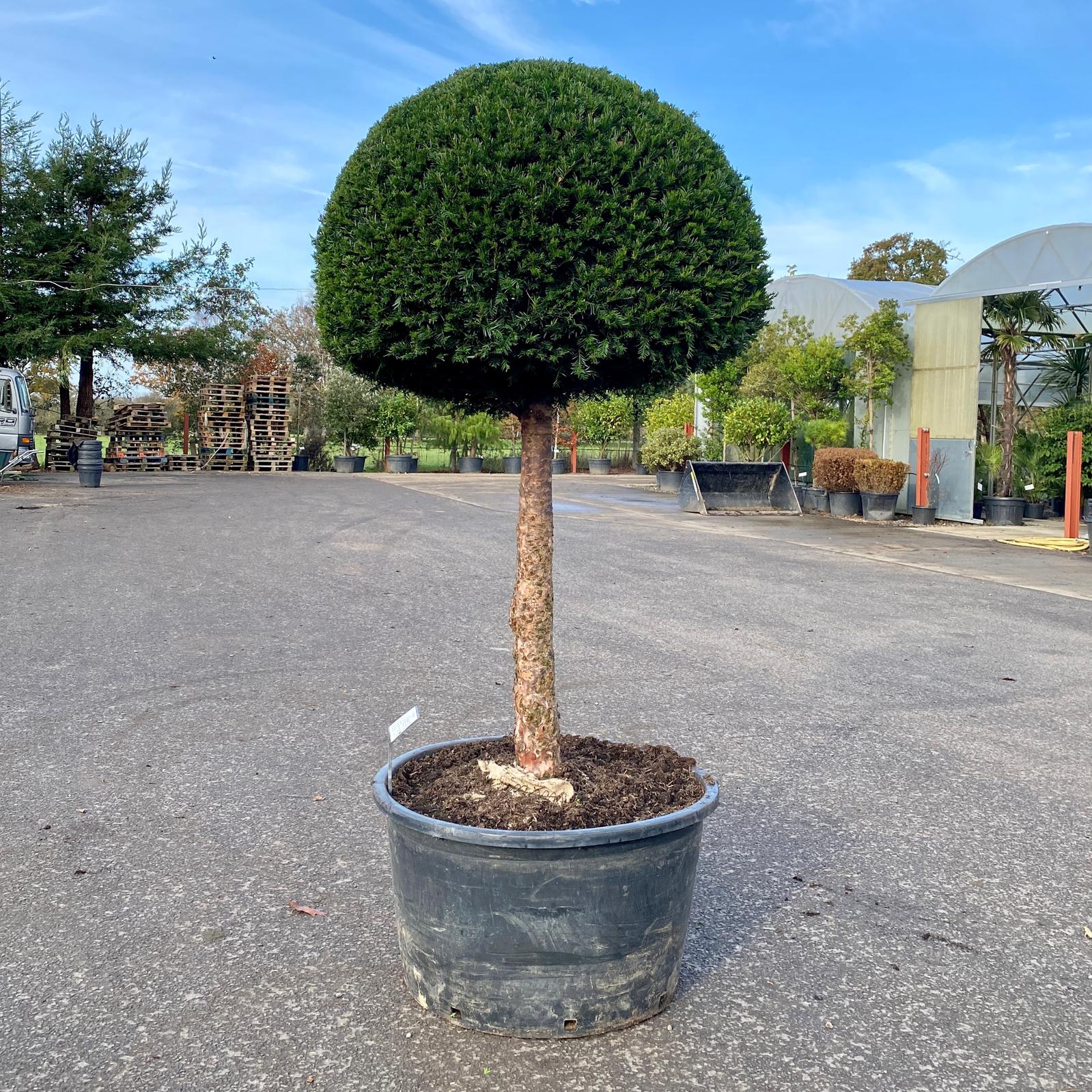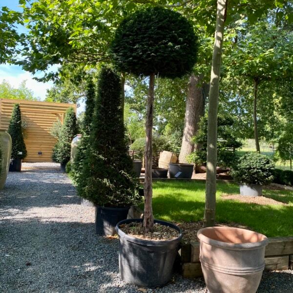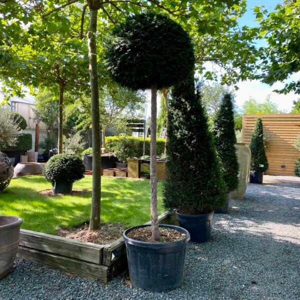 Topiarised yew standards show off all the best features of Taxus baccata. The characterful and tactile bark matures over time to show off rich hues of bronze and red and subtle swirling furrows of knotty wood. The sumptuous, fluffy textural foliage then combines to create a luxuriant time-honoured looking evergreen tree.