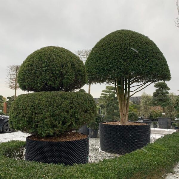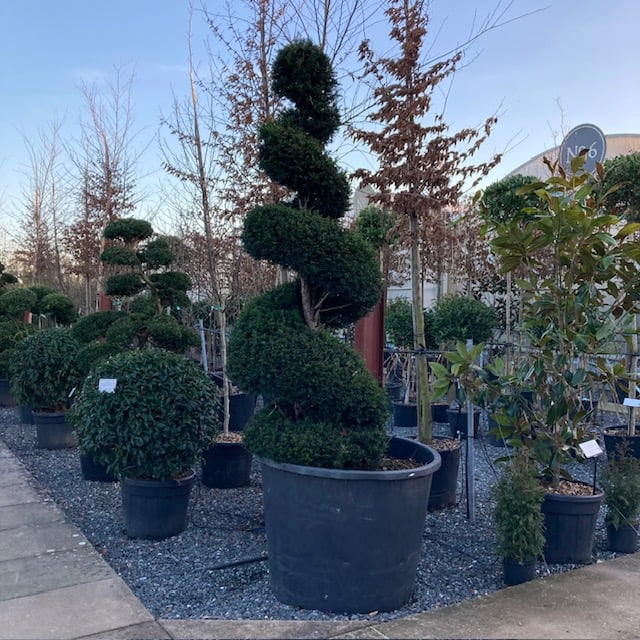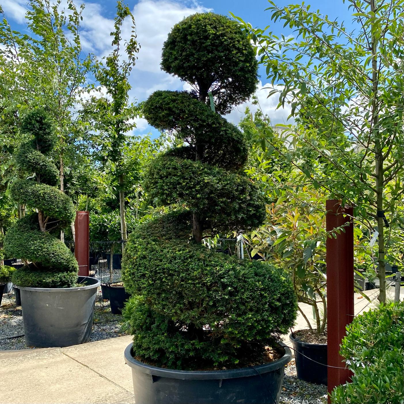 As large mature specimens, they can be planted for immediate impact and ideally require considerable space to both accommodate and appreciate them. A few suggested uses: focal points, centre pieces or, of course, gatekeepers. Will also require a fair amount of light either in dappled shade or sunlight. Will need attentive care when first planted and clipping at least twice a year to keep in perfect shape. Happy in clay, dry / well drained soil but not good on chalk (Ericaceous). Sizes vary from 1.5m to 2.9m. Relatively slow growing.