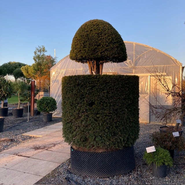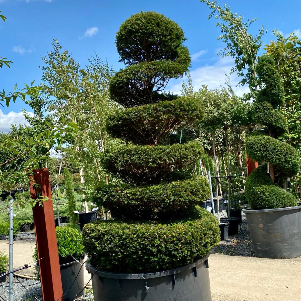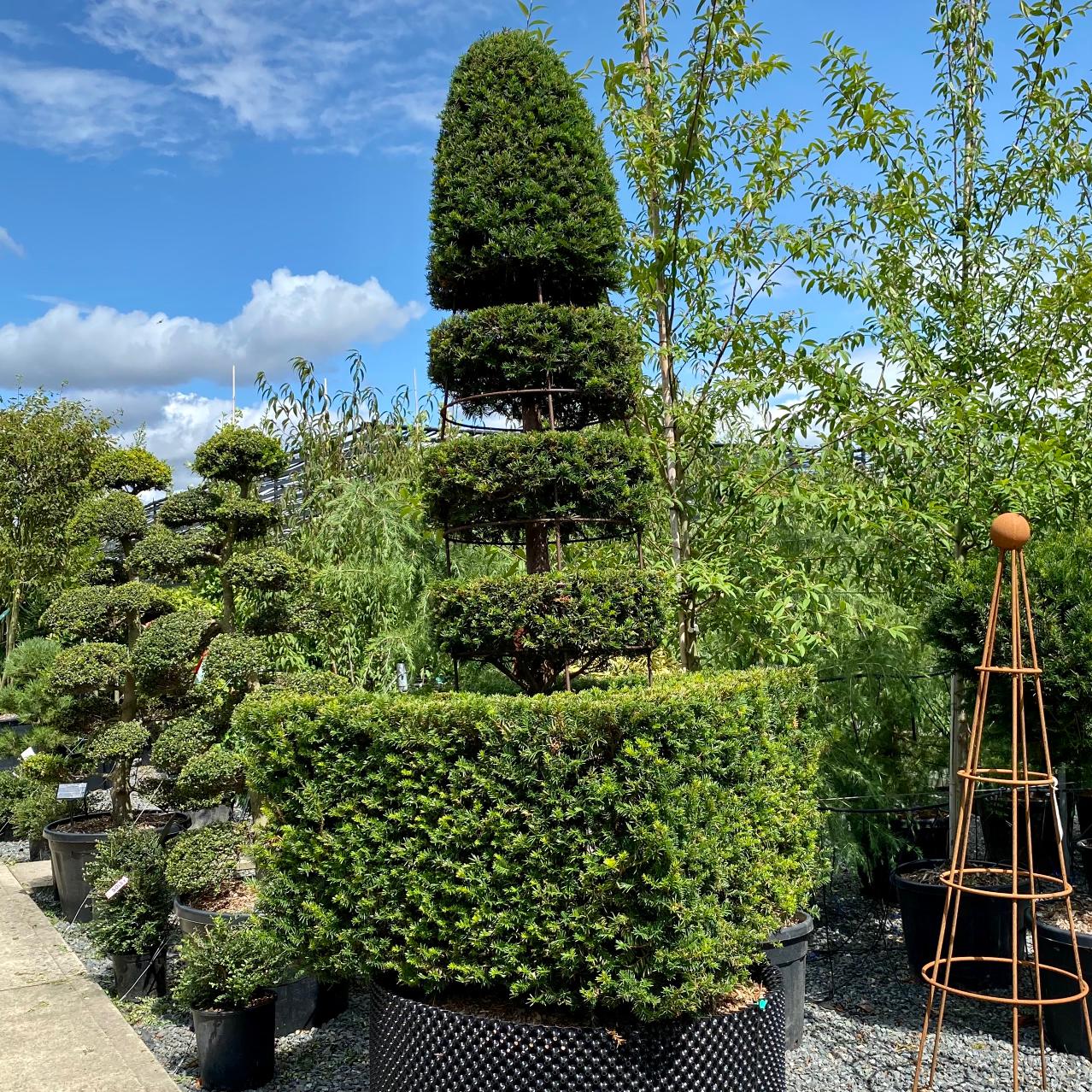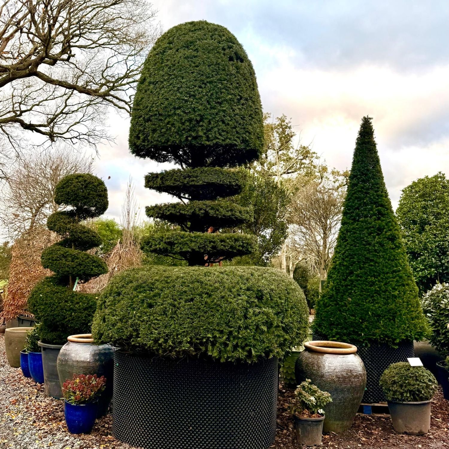 Short of owning your own garden maze, our raised stem topiary yew cubes, yew gatekeepers with ball top or mushroom top, and yew spirals are the ultimate statement in topiary splendour. Persuadable and co-operative to shaping, Taxus baccata will dutifully maintain pretty much any shape demanded of it. These are clipped and trained in a style synonymous with those found in the gardens at Chateau Villandry in the Loire Valley.