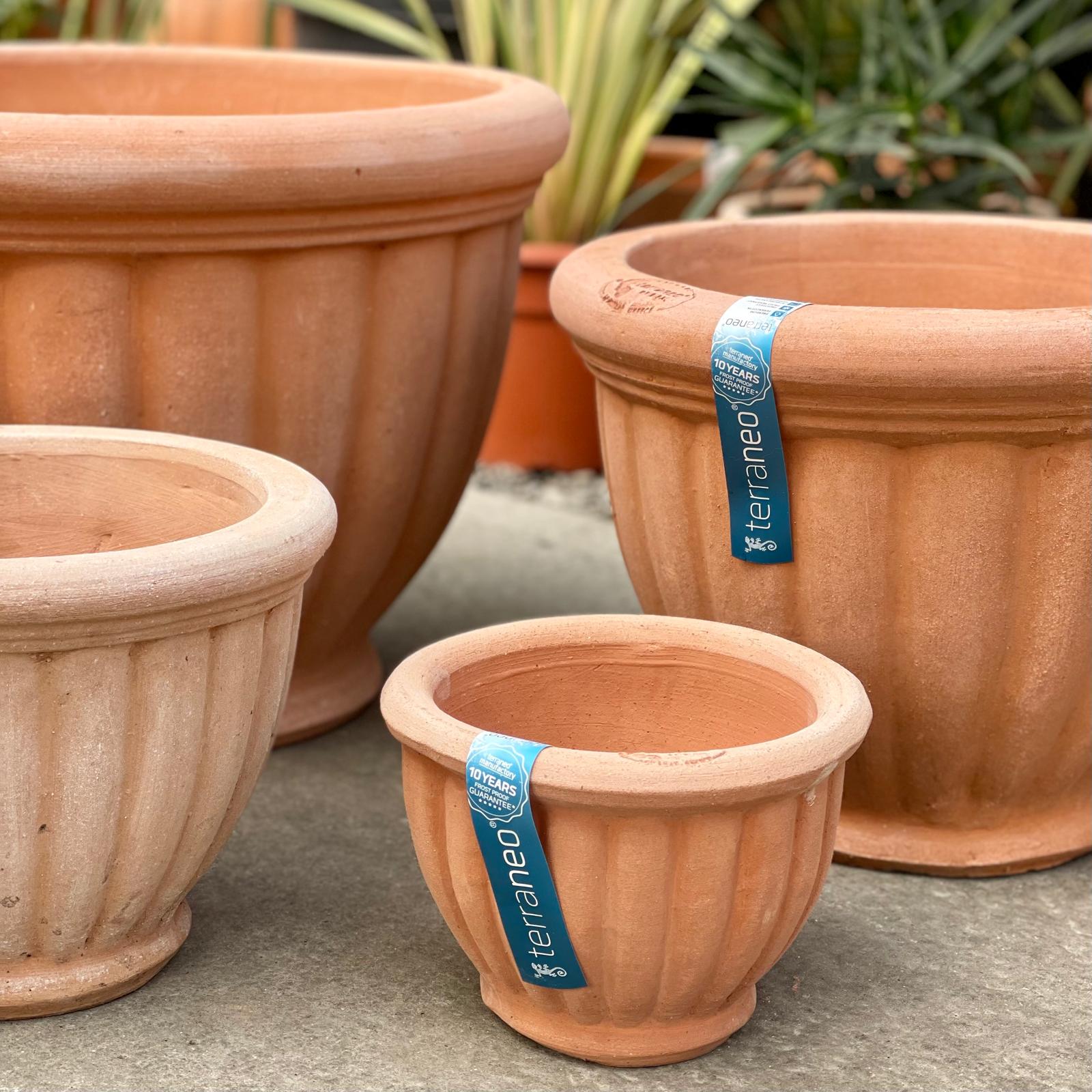 The elegantly fluted Terraneo Bresso Terracotta pot range brings classical character and a dash of antiquity to a garden: the gentle proportions of these pots are deceptively generous. We’ve curated a range of heights and sizes, so you can lay out a whole spread of them on your terrace filled with an array of small trees, shrubs and seasonal highlights. You can create really impactful compositions, instantly, with really very little effort in this manner using just one style of pot. We’d go for Bresso any day.