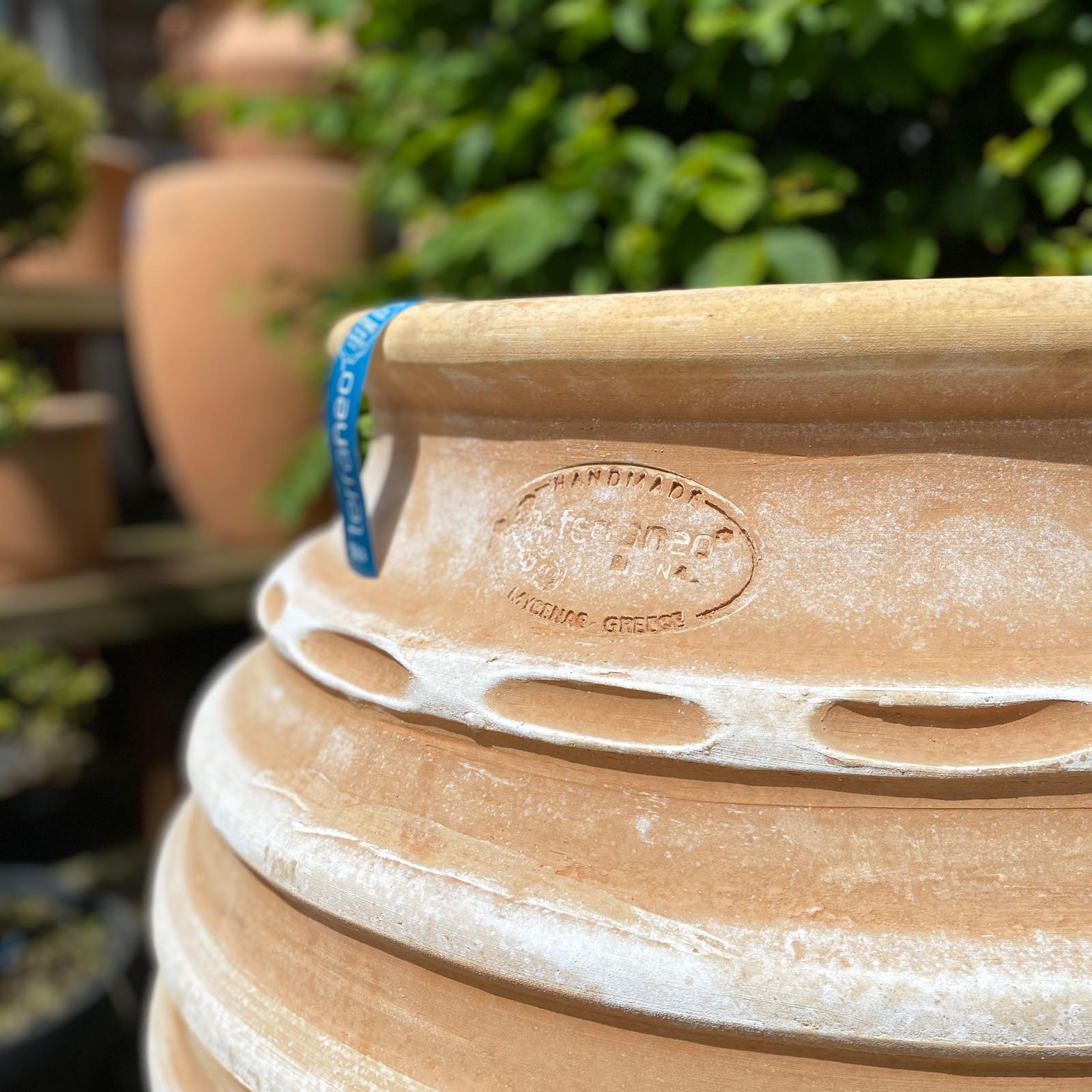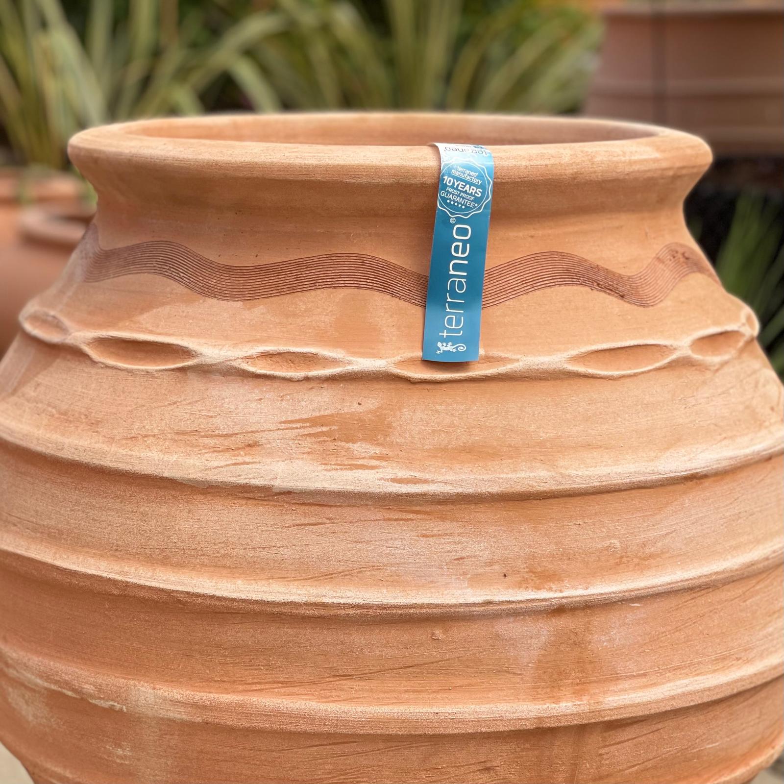 Crafted from Cretan superior terracotta, the ‘Koronios’ is an individually handmade vessel from our exclusive Terraneo range. Made with the highest quality Pelopenessian clay for a lighter finish and great strength, this material has been relied upon for centuries to withstand bitter Greek winters. In fact, they’re certified to be frost-resistant up to -50º Celsius. As the sole distributor of these pots in the UK, we’ve curated a wide range of sizes and unique styles for your exclusive perusal.