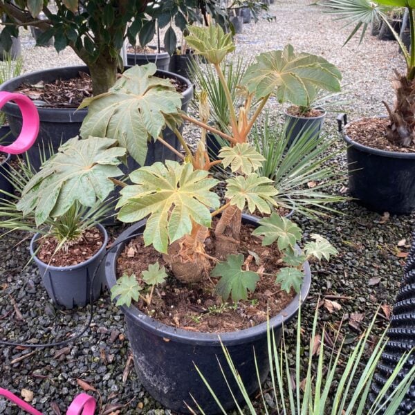 A Fatsia japonica on steroids. Huge leaves, wonderfully eye catching and one of the most exotic plants in a shop full of exotic plants. In all but the mildest and most sheltered garden (if your phone number starts 0207, we're talking about you), the leaves tend to get frost damaged in winter and best to remove them - but the plants are hardy. They start growing when it's still quite cool in spring so winter is short for a Tetrapanax.