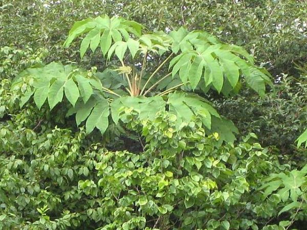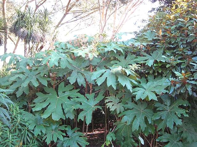 Fast and easy and reliable and exotic but they deserve a bit of tidying up from time to time. Avoid windy sites to avoid damage to the leaves which can grow to 3ft across. Comparisons to Fatsia japonica are reasonable (they're closely related) but this prefers full sun to shade - as opposed to Fatsia that likes shade.