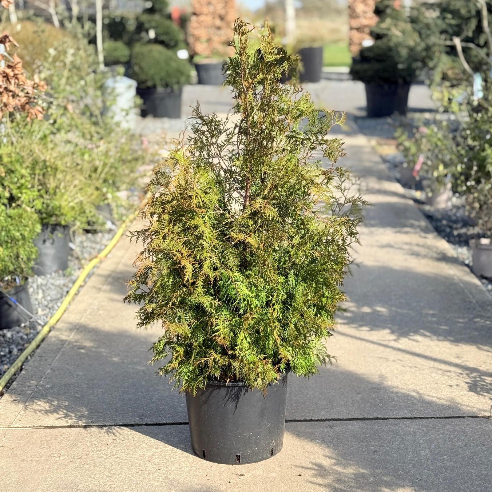 Still here? We’re pleased about that because we’re really quite into this shapely and versatile conifer. Trees with a naturally narrow pyramidal shape are rather special and being a conifer it keeps its coat on all year so will remain steadfastly structural and interesting in every season. Some conifers are prone to browning of the needle ends during winter and this can make them look dull and rather flat: they are evergreen undoubtedly, but greyish and lacking in vitality at a time when you really want some proper green. This Thuja holds onto its splendid rich green all through the chilly months and won’t let you down.