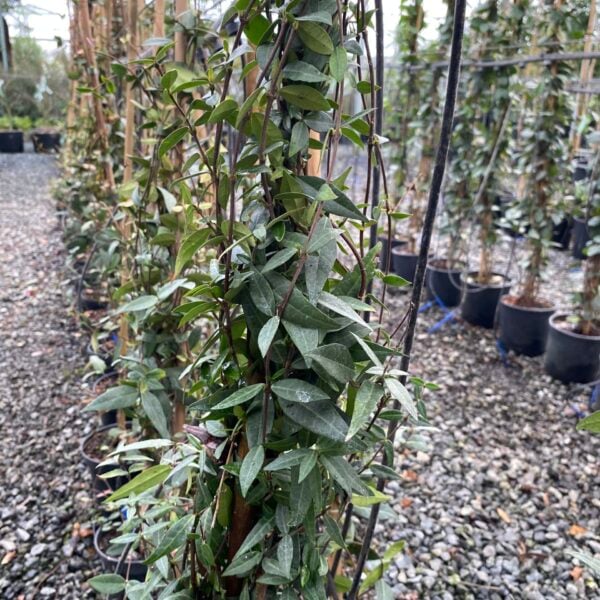 Very fine evergreen climber. Dense mass of small leaves and tiny cream flowers in June and July with the delicious smell of Gardenia. Slow growing.