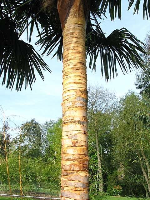 The nicest ones I've ever seen are in woods where there's no wind so the leaves don't get damaged and the low light causes the leaf stalks (petioles, properly) to elongate giving the whole head the appearance of being bigger and more elegant. Now remove the hairy stuff (see link at bottom of page), all the old flowers (okay, haddocks) and any old, yellow, brown or tatty leaf and cor blimey - is this really the same plant as the ones in front of The Pavilion? An astonishing difference. Removal of the hairy stuff reveals the rather lovely stripy trunk but also reduces the diameter of the trunk thereby producing a better proportioned plant. This is Creative Maintenance at its most enjoyable. In case you're wondering - removal of the hairy stuff does not affect the plant's hardiness. It's reasonable to assume a connection between the world's most frost tolerant palm tree and a warm hairy trunk. There appears to be none. There's a remarkably similar looking palm (with a similarly hairy trunk) called Trithrinax. They can be found growing in equatorial Brazil.