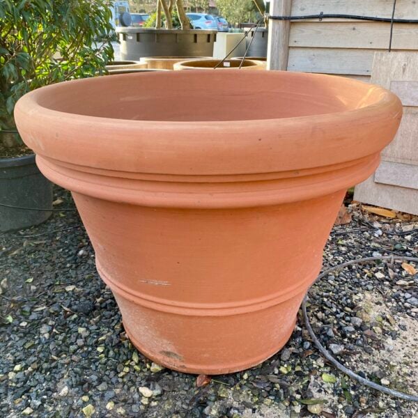 Elegantly finished pale terracotta planter with a large rolled rim and ridged detailing. Ideal for bulbs to add a splash of colour to the patio, or a more formal, architectural plant beside a door or entranceway.