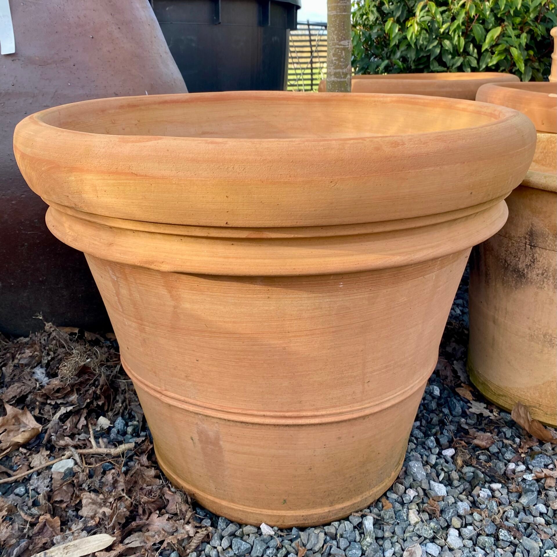 Elegantly finished pale terracotta planter with a large rolled rim and ridged detailing.