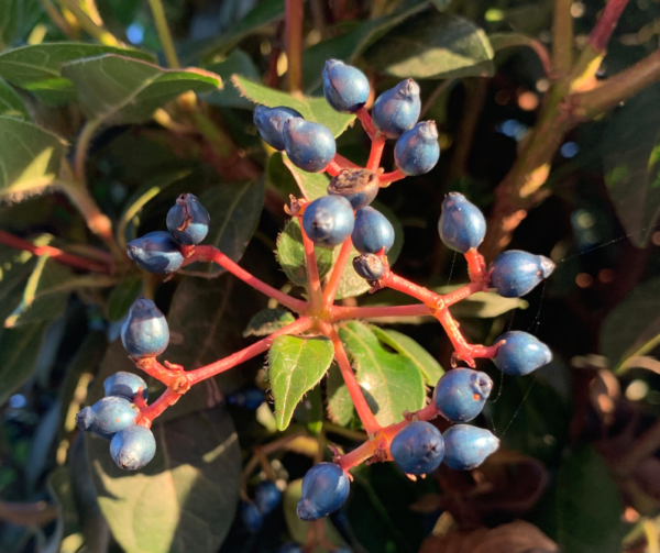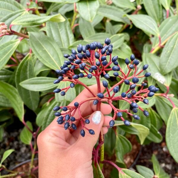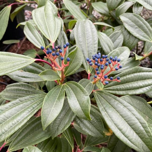A lovely medium-sized evergreen shrub that naturally forms a neat dome or mound of dark green, very handsome leaves. The foliage is deep green, their shape elliptic (pointy ovals) with 3 crisp raised veins making each a work of delicate art. Could be described rather unkindly as ‘leathery’ but this is a premium hide and their thick robust quality gives them a strong architectural form. Small clusters of pinky-white flowers will appear in late spring and these bring an added dimension to this desirable shrub. If plants of both sexes are grown close together then come autumn you’ll have sprays of metallic blue berries which look so shiny they could be chromed. Happy in shade or semi-shade, this shrub is super for establishing evergreen interest in a garden design, and it is extremely hardy to boot.