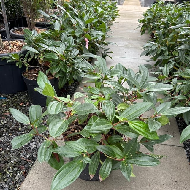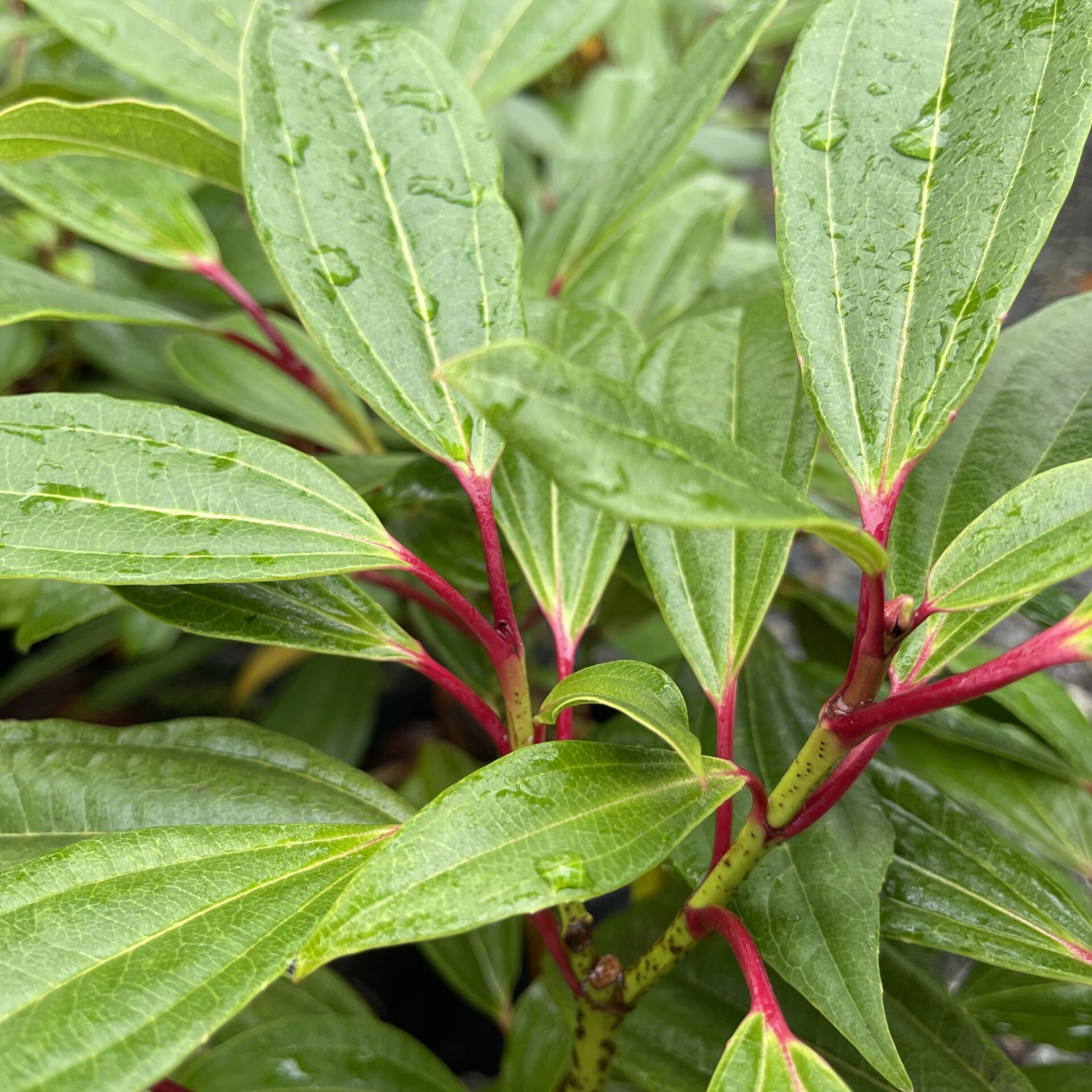 A lovely medium-sized evergreen shrub that naturally forms a neat dome or mound of dark green, very handsome leaves. The foliage is deep green, their shape elliptic (pointy ovals) with 3 crisp raised veins making each a work of delicate art.