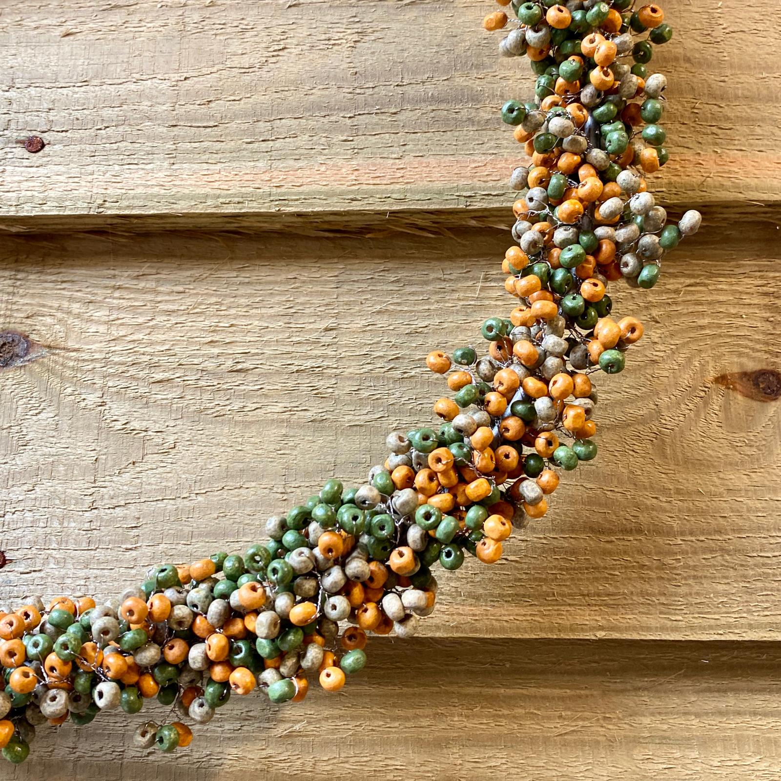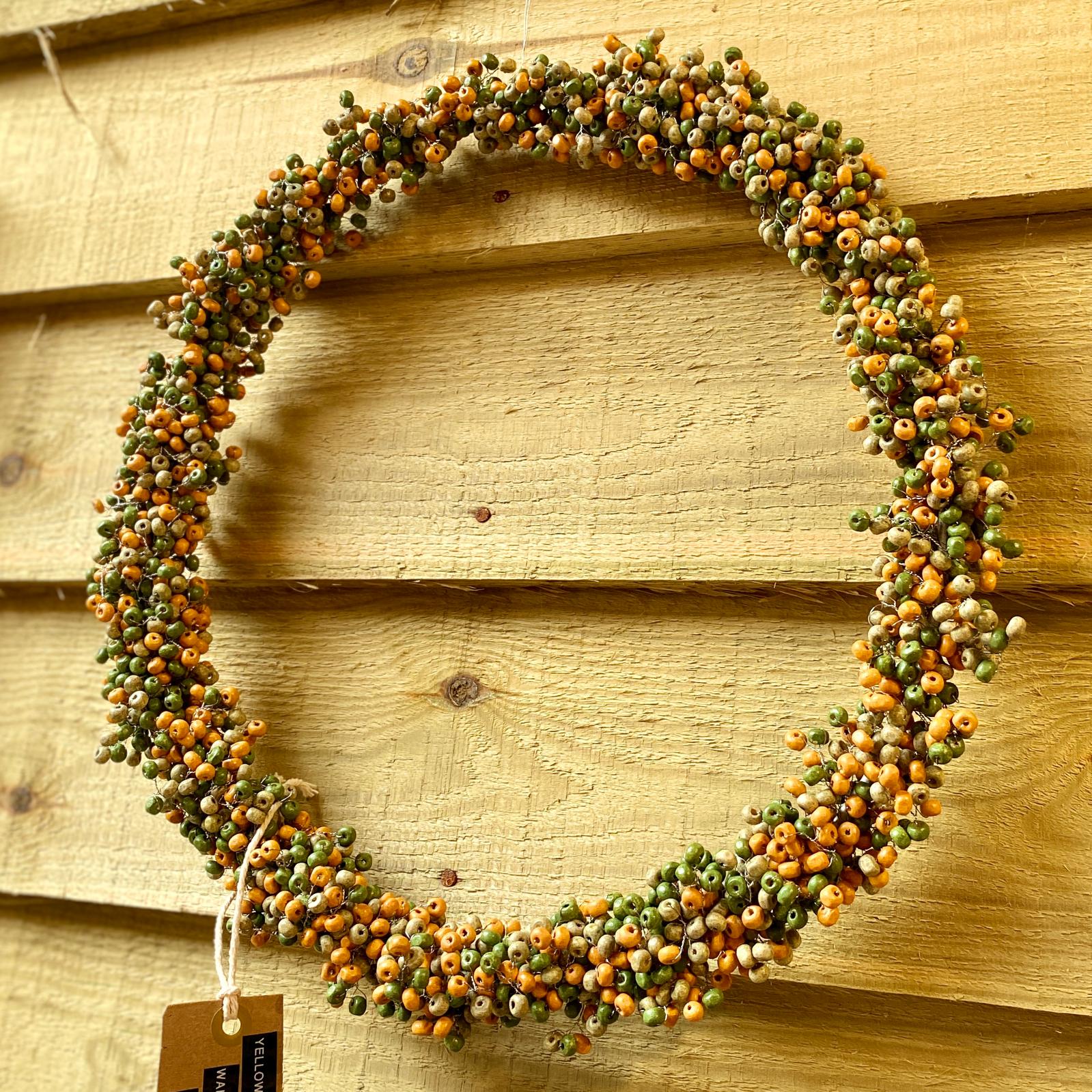 Delicate, earthy and full of texture, this Wall Wreath is crafted from clusters of yellow and green beads in muted harvest tones. The tightly wound beads form a clean, circular silhouette that’s both rustic and refined — ideal for adding a touch of seasonal colour to your walls, doors or display shelves.