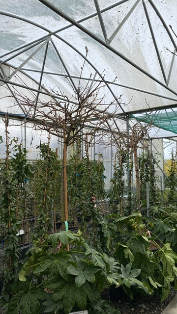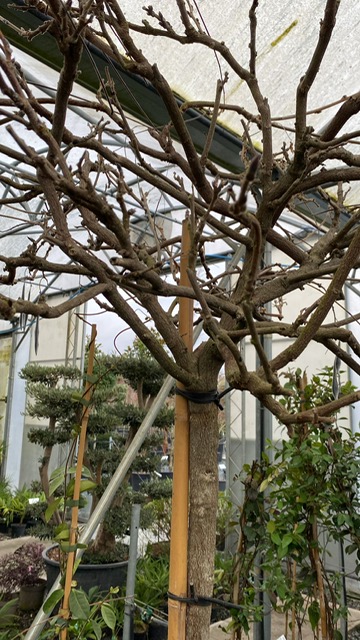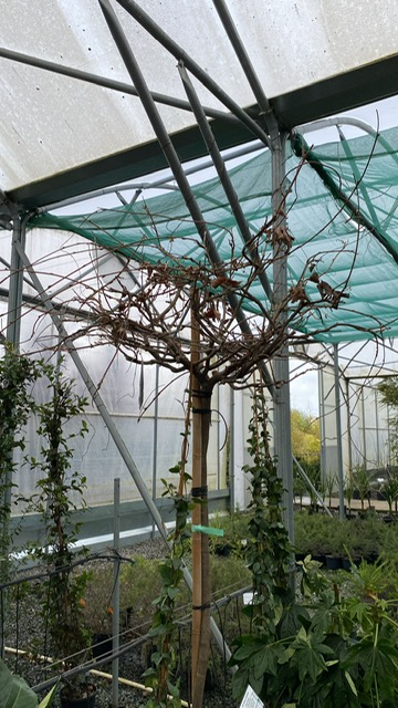 A standard-grown Wisteria transforms a rampant clamberer into a well-behaved tree, basically. Carefully cultivated and trained to produce a strong trunk with a defined crown at the top, all that vigour is channelled into achieving a tremendous architectural shape that stands up all by itself. Buckets of trembly lilac flowers will cloud over the bare branches in spring and these ones are at perfect hooter-height for breathing in their lovely fragrance. Leaves come after, rapidly clothing the crown in a big puff of frothy foliage and really enhancing the tree-like quality of these plants. They really are smashing grown this way: they can be planted into borders as specimens and don’t require an arbour or pergola or similar structure to grow up. Very well-behaved and far less inclined to go wandering for trouble, they are incredibly easy to prune and keep neat. We find their cloudy forms a nice foil and alternative to some of the more tightly-clipped garden trees and if you want an informal dollop of architecture for a Mediterranean or more naturalistic scheme, these are for you.
