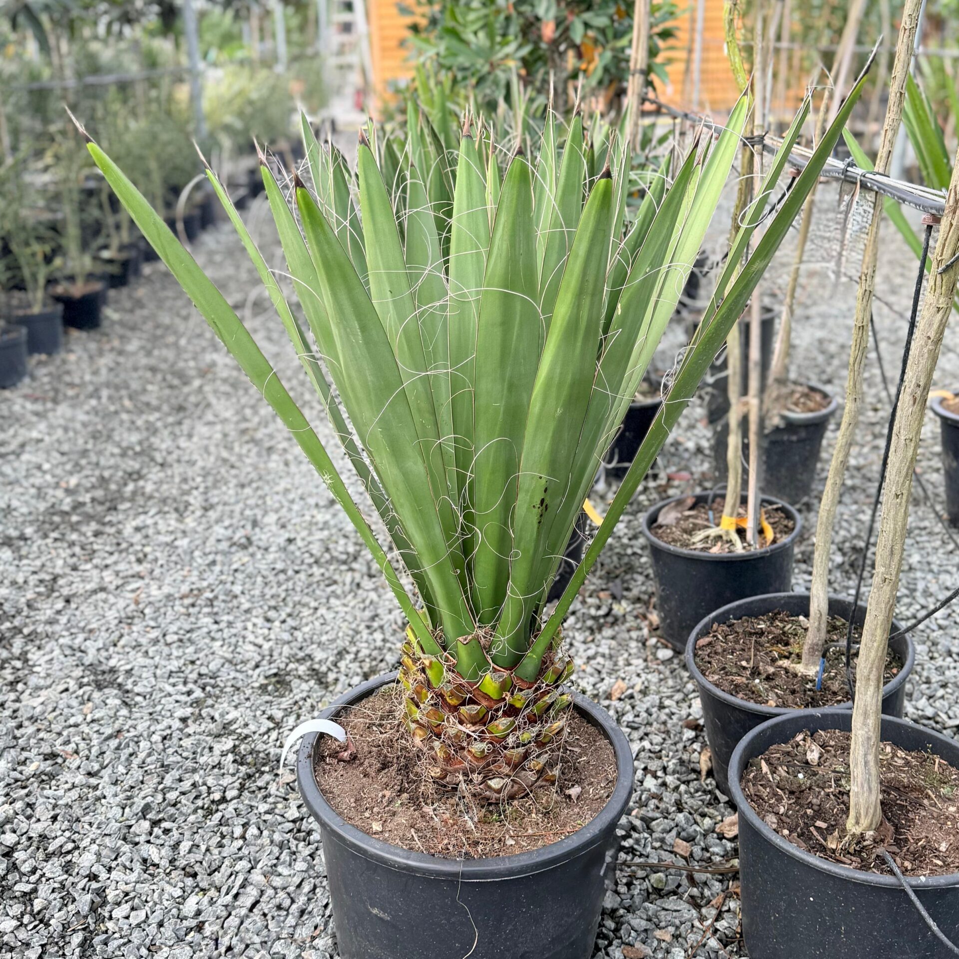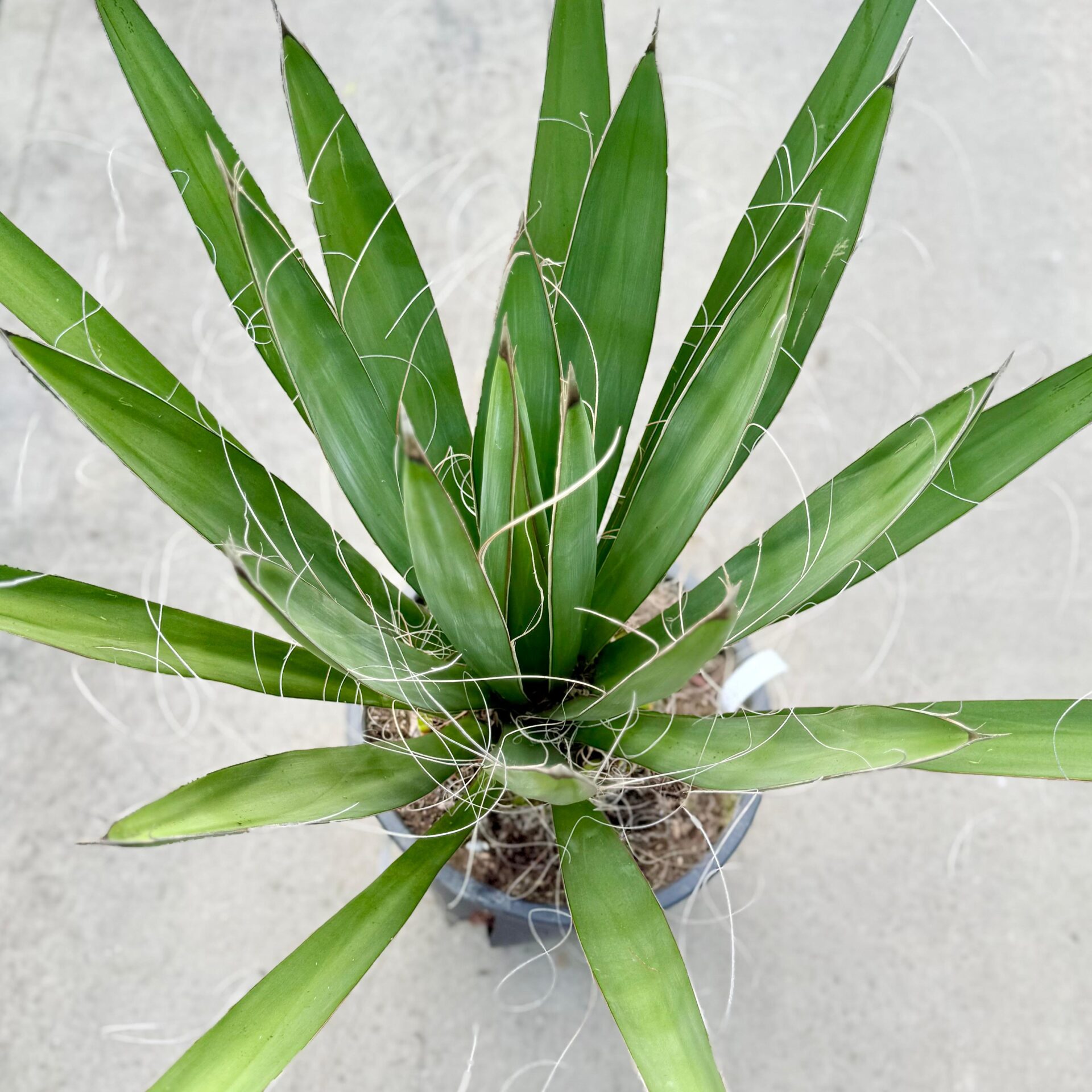 A magnificent yucca from the desert lands of northern Mexico north to the mountains of Western Texas. It forms a stout trunk surmounted by a symmetrical crown of broad green leaves held stiffly in a ball from the central growing point. Each leaf has both a brown margin and then a white outer edge carrying curly white filaments along their length.