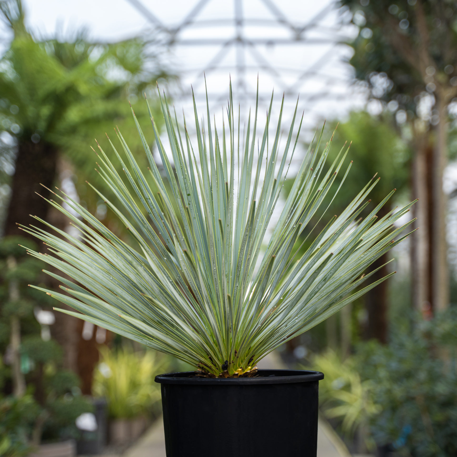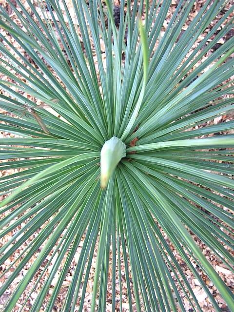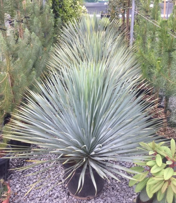 Wonderful thing. Narrow blue leaves and an almost hemispherical head. They can form quite a tall trunk even in Britain - to 6ft after many years (40?). These come from dryer areas than our other (non-desert) yuccas and need pretty sharp drainage and lots of sun. Remove old and dead leaves if you like that 'look'. Despite their arid provenance, they seem less prone to black fungal spots than our other yuccas and also, appear not to branch after flowering. In those two respects they seem to have more in common with Dasylirion. The flower is a huge white spike as on all the yuccas. Remove with secateurs as soon as the flowers fade.
