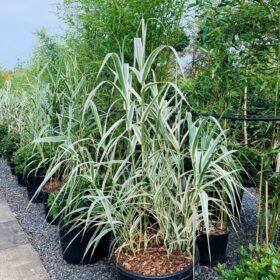 The variegated sugar cane lookalike seen in wet places throughout the Mediterranean. Dies down in winter. Dramatic yet well behaved. Grows to 10ft. Exotic.