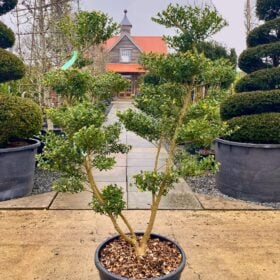 This is an evergreen shrub or small tree. A slow growing native of Japan where it could eventually reach 8 metres in height. Excellent for clipping, shaping and topiary. Very hardy, not fussy about soil but does not like to be waterlogged. Happy in sun or some shade. Please contact us for stock availability and sizes.