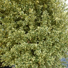 Variegated Box. As tough and vigorous as the green one. Rare. Probably a victim of a certain snootiness about variegation that we sometimes share. Not in this case. Please contact us for stock availability and sizes.