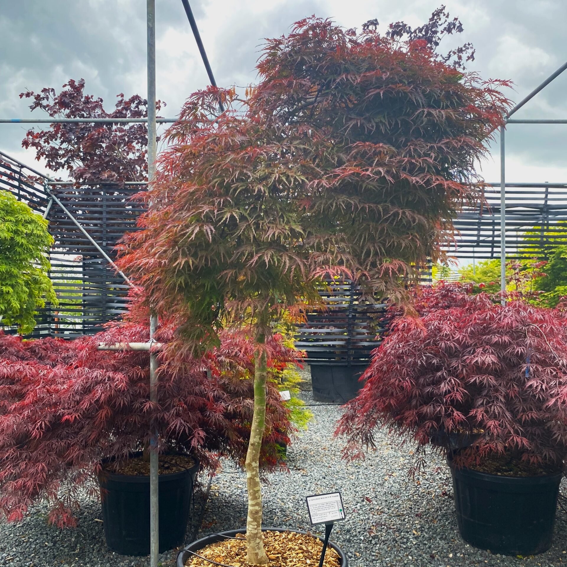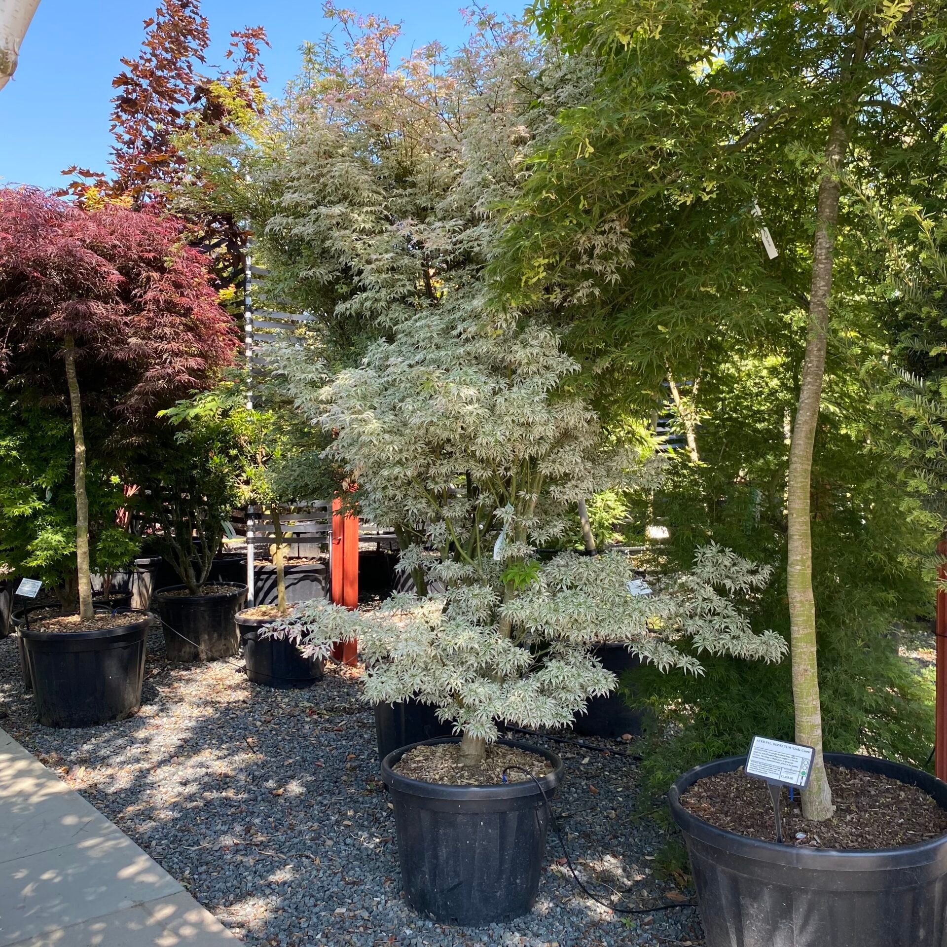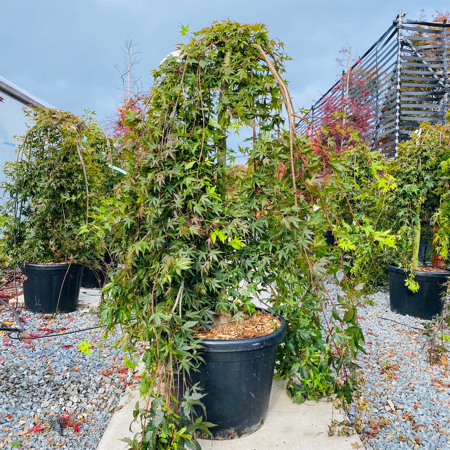 We’ve recently completed work building a large shade house. Designed as a place to keep our ever expanding collection of large Acers, it’s a wonderful place to go hunting or just bask in the flurry of colours, leaf shapes, stems and trunks. The Acer House was finished in 2022 spanning over 450 square feet and is bursting with a vibrant myriad of colour right through to the end of November each year.