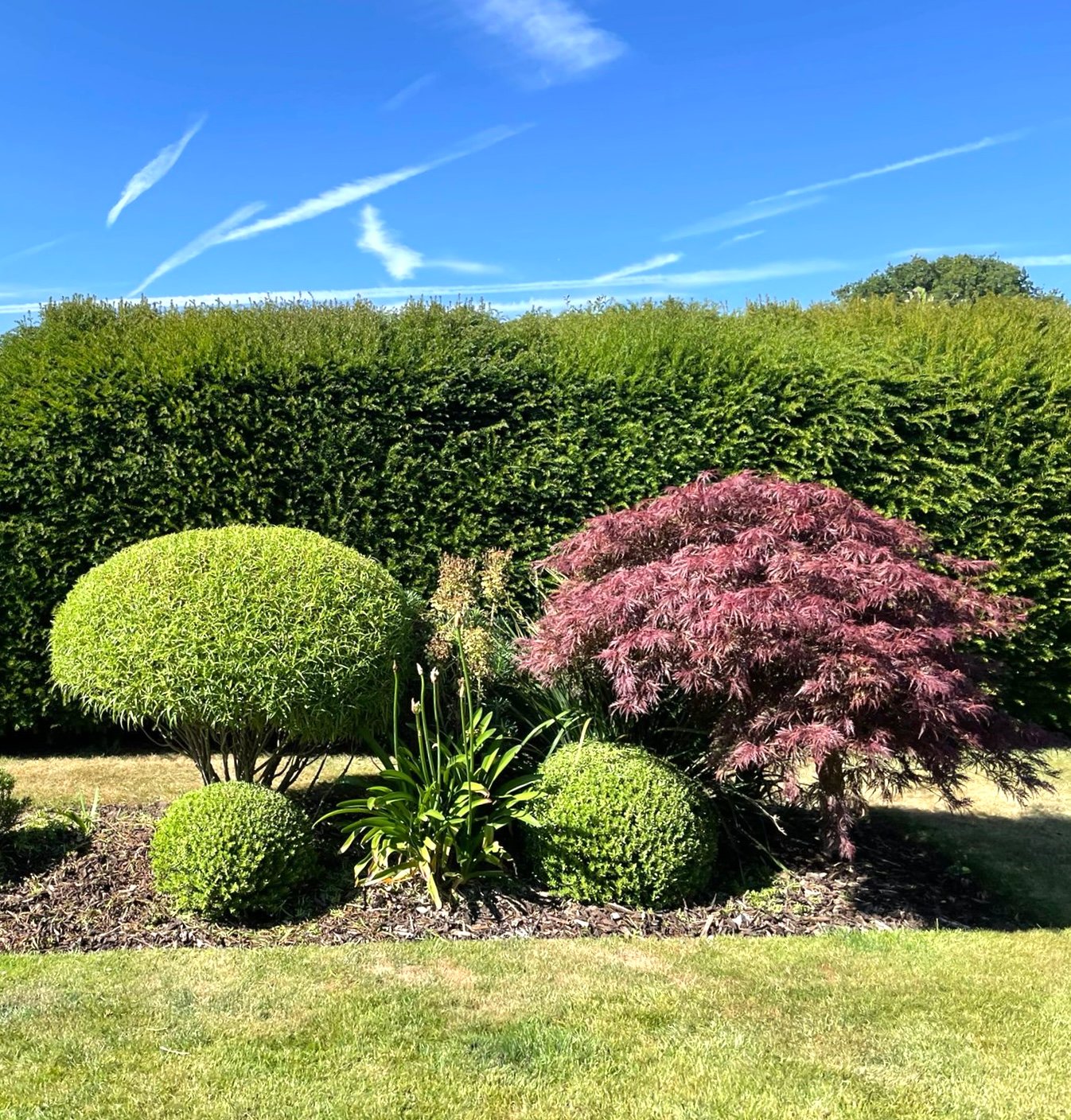 Taxus baccata (Yew) look eminently ‘posh’ clipped as balls, blobs and cones. A native European plant, it has been a stalwart of formal gardens for centuries. With their compact and solid habit you can give them crisp lines and defined trims. If you then plant a number to create a blobbery, it can then surround an Acer planted as a centre piece. Grows in light shade or sun but needs reasonably good drainage.
