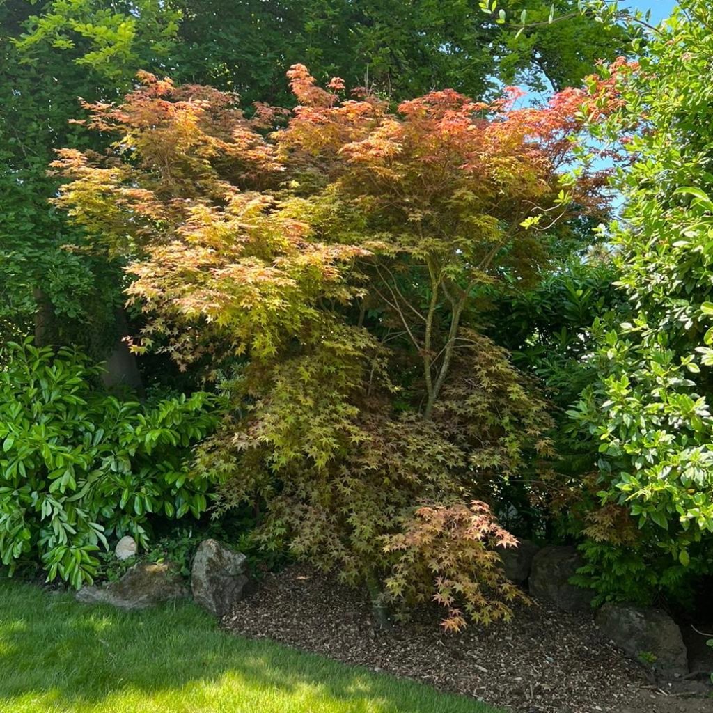 Japanese Acers grow best in a sheltered position with dappled shade. Red and purple-leaved varieties need some sun to develop their dark hues fully. Variegated Japanese Acers need partial shade to prevent the afternoon sun from scorching the foliage. Green-leaved forms tolerate full sun, but are best in dappled shade as very bright conditions can sometimes cause scorch. Yellow-leaved varieties and some of the red forms are most at risk of scorching, but this is not always obvious, because usually, the only sign of too much heat is some browning of the leaf tips.