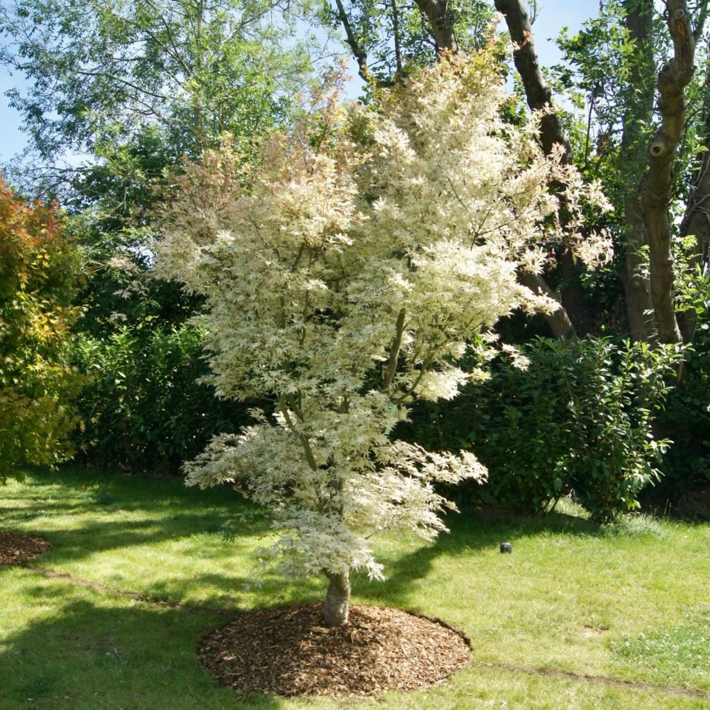 ‘Ukigumo’ is a deciduous shrub or small tree with a most outstanding variegated foliage. Emerging pale green in spring with white splodges and shades of soft pink at the edges. The medium-sized leaves are very deeply divided and radiate openly. Later in season, the pink fades away and the foliage turns yellow-orange in autumn before shedding.
