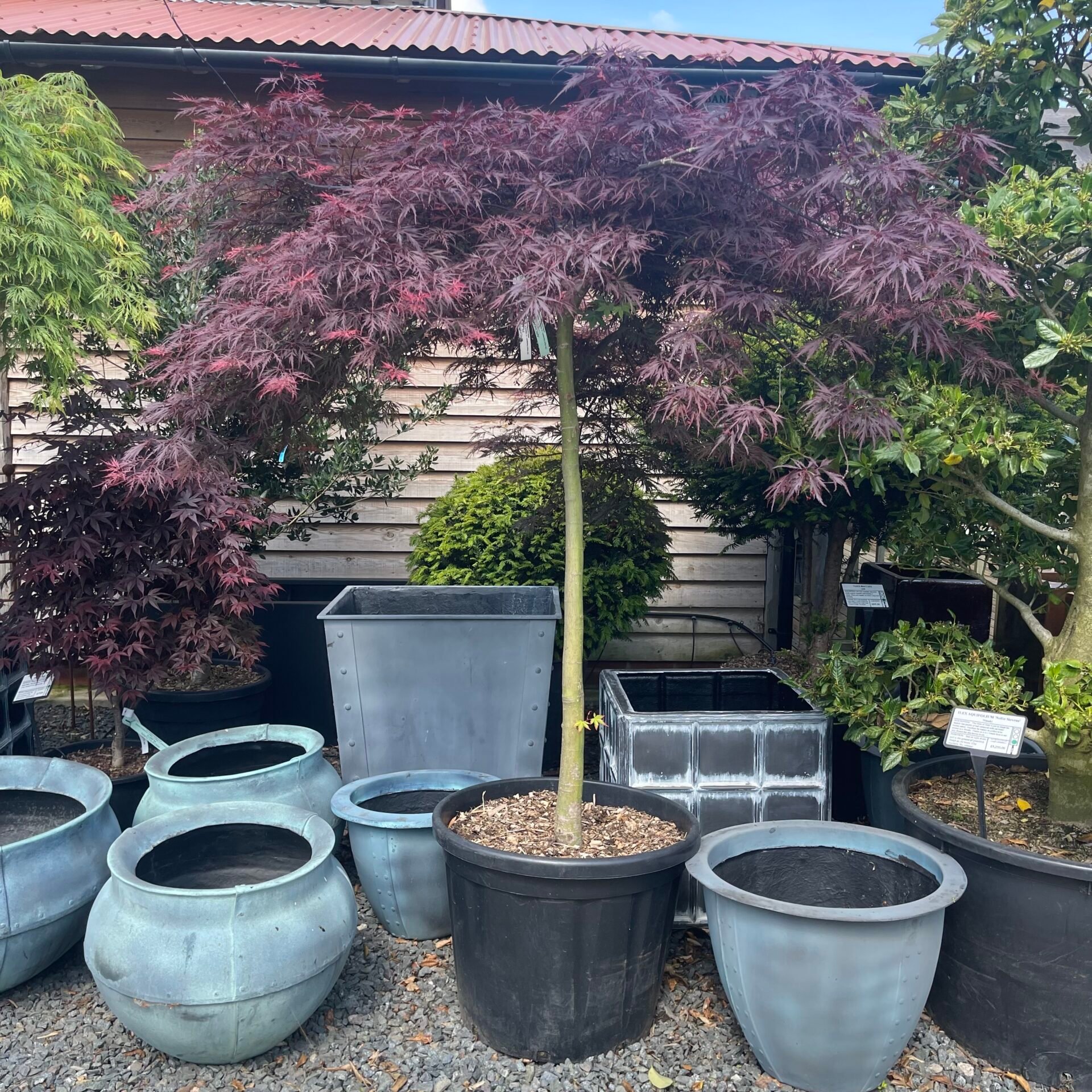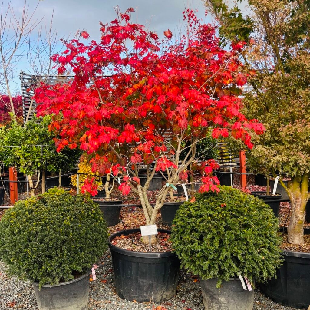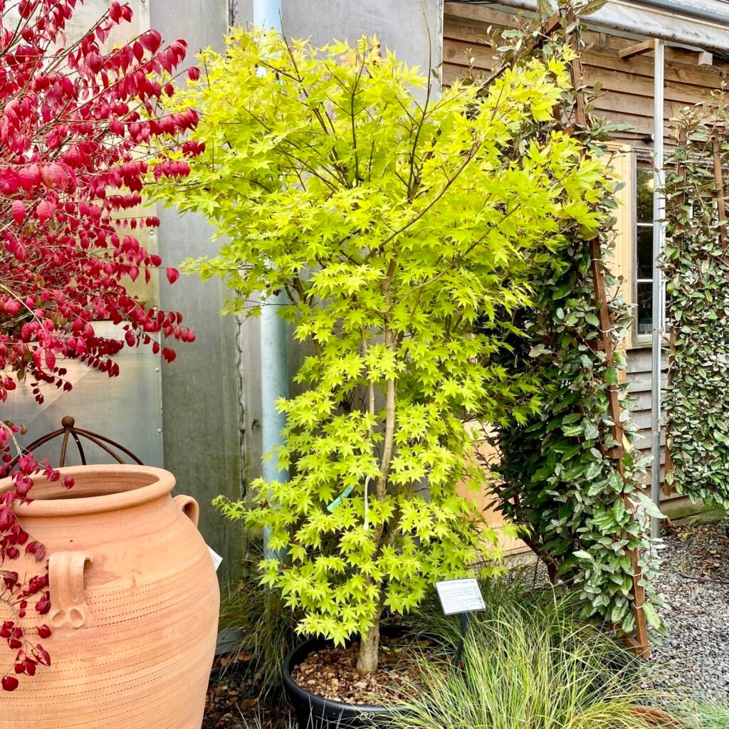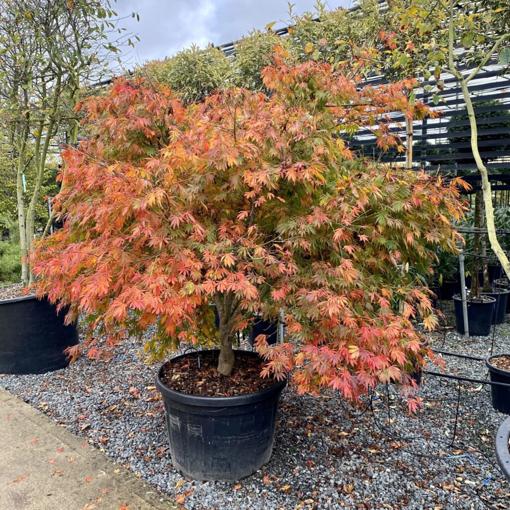 Acers are deciduous trees and chose to drop their leaves at different times either when approaching or late on in autumn. This habit depends on their variety. We keep an extensive collection of our favourite Japanese maples (Acer palmatum) which hold onto their colour late into autumn. They are generally slow-growing and come in a range of forms such as weeping, upright and spreading.