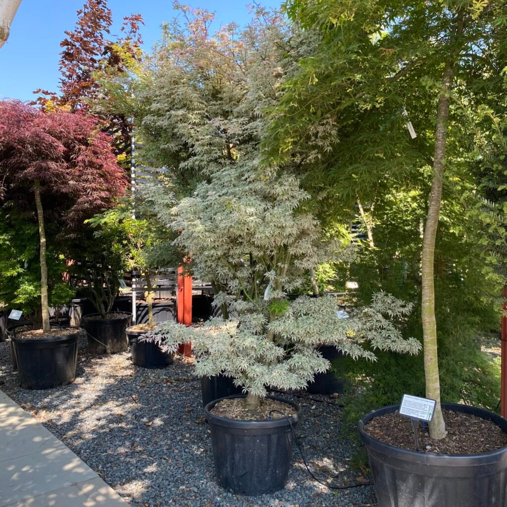 ‘Asahi- Zuru’ is a semi-dwarf beautifully variegated Acer. The stems on the new growth are red and the foliage comes through a combination of white and pink then into a deep green. They sometimes have an entirely white or pink leaf. Autumn foliage is a stunning blend of oranges and reds.
