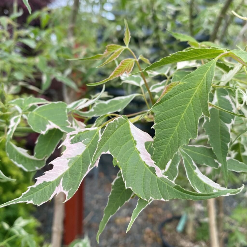 ‘Flamingo’ is an interesting little deciduous tree. It has green, white and pink variegation on the pinnate leaves.